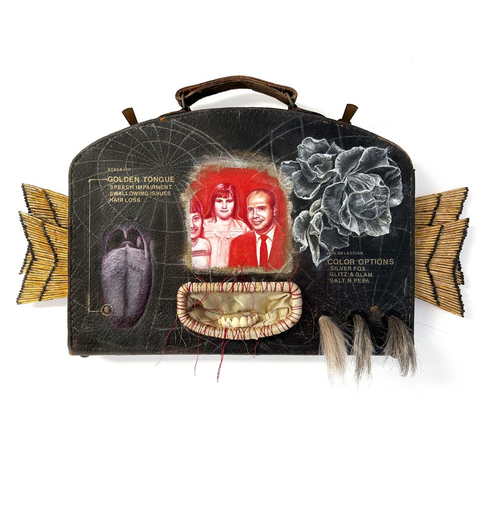Travelling Man Mixed Media, 2025.22″ X 13″ X 3″Oil and acrylic on vintage suitcase with artificial hair, dentures, thread, fabric and matchsticks.